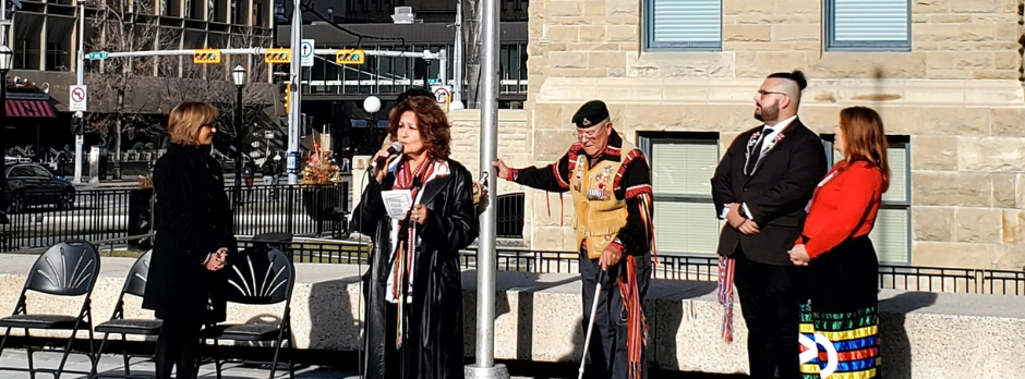 On the afternoon of November 12, the Elbow Métis District commenced Métis Week with two ceremonial flag-raising events, held at City Hall and Mount Royal University, in partnership with the City of Calgary and Mount Royal University. These events brought together community members, city officials, and students to honor the Métis flag—a powerful symbol of pride, resilience, and the ongoing journey of the Métis people.